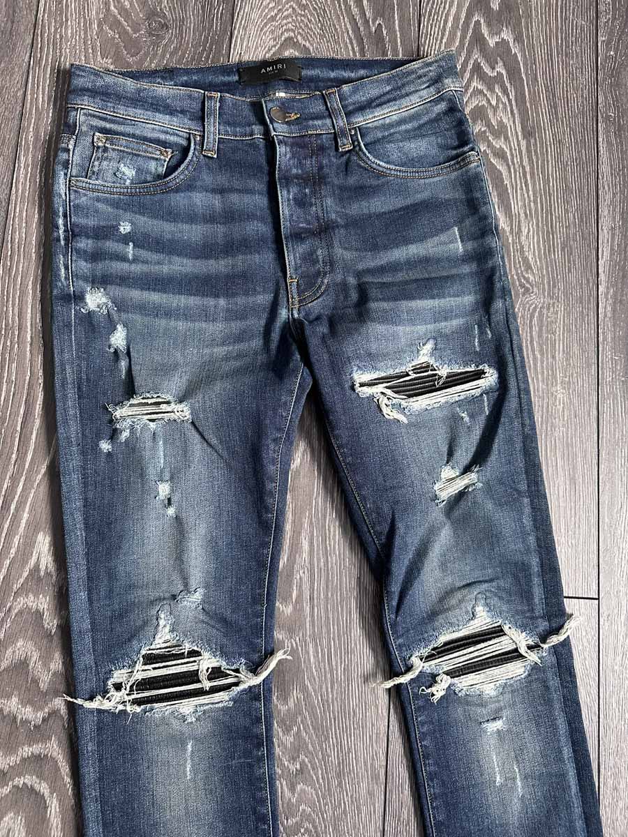 Amiri leather patch dark blue skinny jeans